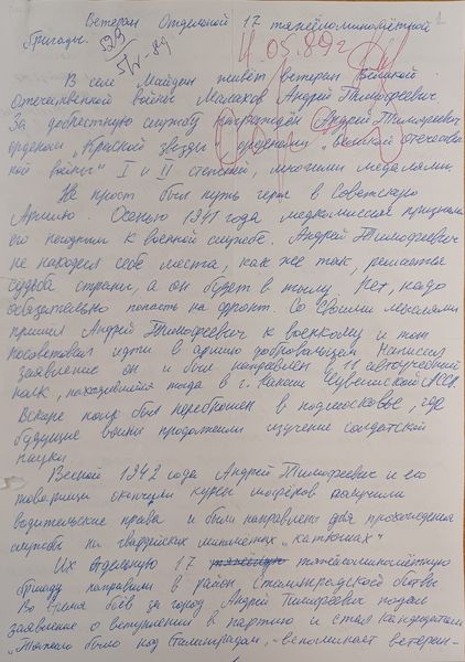 В Верхнеуслонском муниципальном архиве имеется Коллекция документов «Воспоминания о ветеранах Великой Отечественной войны». Предлагаем ознакомиться с воспоминаниями нашего земляка Малахова Андрея Тимофеевича, ветерана Великой Отечественной войны, кавалера Ордена «Красной Звезды», записанными в 1989 году А.Алешиным.