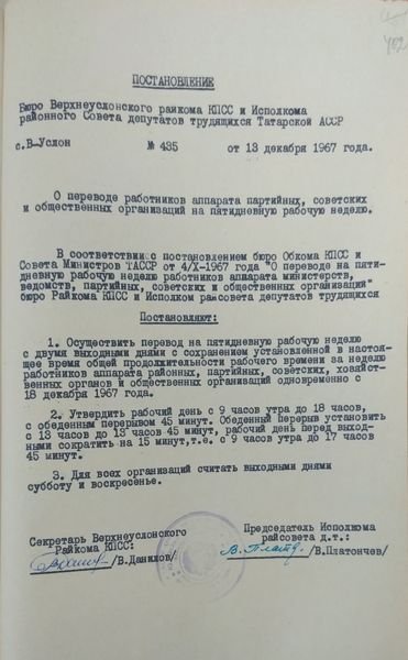 Так, например, согласно решения исполкома от 07.02.1968 г., учитывая многочисленные просьбы трудящихся детские ясли, детские сады с.В.Услон были переведены на 6 дневную рабочую неделю с 8.00 до 18.00.