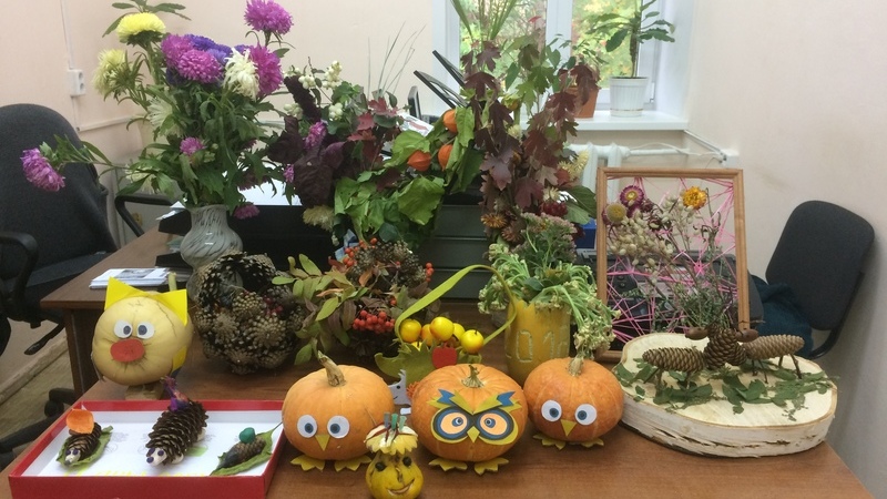 В рамках декады дня пожилого человека, среди получателей социальных услуг, был объявлен конкурс «Золотая осень», изготовление поделок из природных материалов. Приложив старание и фантазию подопечные отделения надомного социального обслуживания вместе с социальными работниками создали поделки, причем каждая из них не похожа на другую. В работах были использованы различные природные материалы: тыквы, кабачки шишки, листья, желуди, ягоды.