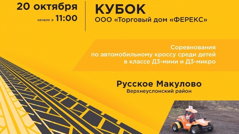 20 октября 2018 года в селе Русское Макулово состоятся соревнования по автомобильному кроссу среди детей в классе Д3-мини и Д3-микро на кубок ООО "Торговый дом "ФЕРЕКС".