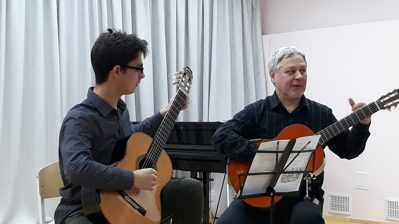 В актовом зале ДШИ, в рамках музыкально-просветительского проекта «Музыкальная среда», прошел концерт гитарной музыки заслуженного деятеля искусств РТ, доцента Казанской государственной консерватории, композитора Виталия Харисова и его ученика, выпускника нашей школы Айдара Абдрахимова. В программе в основном прозвучали оригинальные авторские произведения В. Харисова, как в сольном, так и в ансамблевом исполнении с Айдаром.