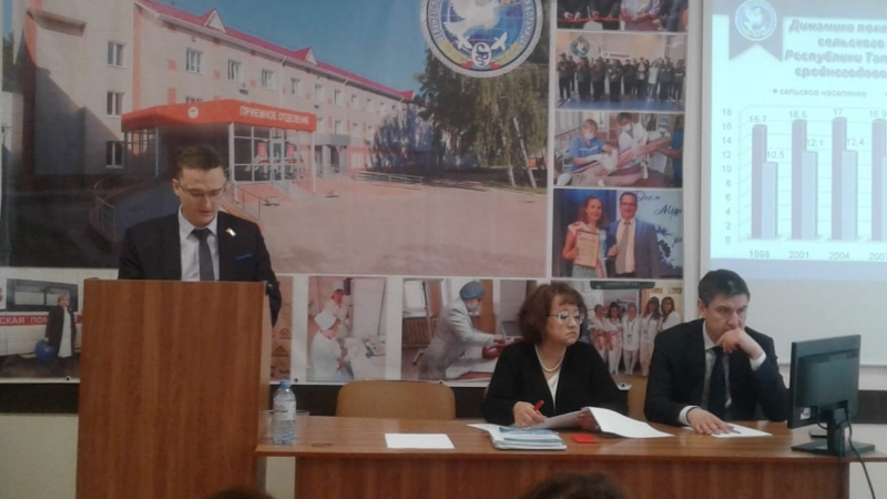 С основным докладом выступил Алексей Смирнов, главный врач ГАУЗ «Верхнеуслонская ЦРБ». В развёрнутом докладе Алексея Олеговича было представлено современное состояние системы здравоохранения района, подробно проанализированы основные причины смертности населения, в том числе граждан трудоспособного возраста, предложены варианты решения имеющихся проблем, обозначены задачи на текущий трудовой год.