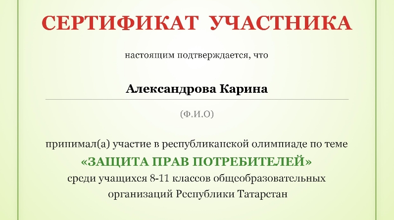 Госалкогольинспекция Республики Татарстан определена координатором программы, одним из приоритетных направлений которой является деятельность по повышению потребительской грамотности, в том числе проведение Олимпиады по теме «Защите прав потребителей» для учащихся средних учебных заведений.
