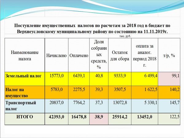 Средний % собираемости имущественных налогов по Верхнеуслонскому муниципальному району по состоянию на 11 ноября 2019 года составляет 38,9 %, в том числе по земельному налогу с физических лиц –40,8 %. По налогу на имущество – 39,3 %. Несмотря на то, что транспортный налог не поступает в местные бюджеты – его поступлению также уделяется большое значение - он формирует доходную базу республиканского бюджета.Поступление транспортного налога от физических лиц по нашему району составляет 37,3 % от начисленной суммы.