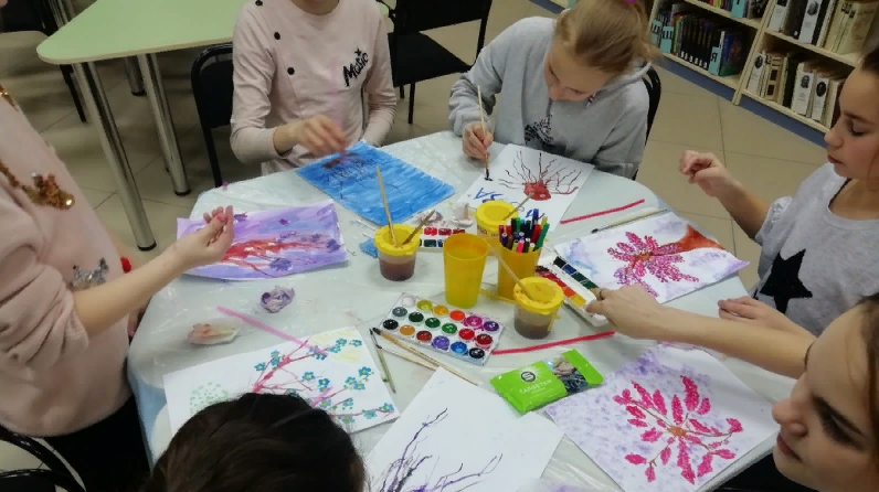 5 марта, к Международному женскому дню, в рамках литературно-творческого клуба «Фантазёры», в Районной детской библиотеке в художественной мастерской «Весеннее настроение», дети познакомились с техникой рисования – кляксография.