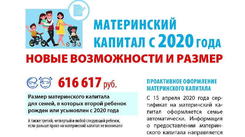 Действие программы материнского капитала продлено на пять лет – до конца 2026 года. Все семьи, в которых до этого времени начиная с 2020-го появятся новорожденные или приемные дети, получат право на меры государственной поддержки в виде материнского капитала.