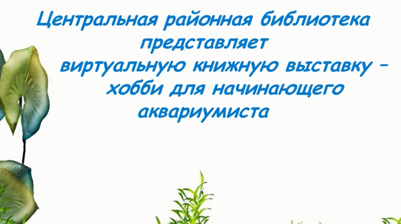 Центральная районная библиотека подготовила для Вас виртуальную книжную выставку-хобби «Подводный мир за стеклом». Выставка представляет обзор книг, как на бумажном носителе, так и в электронной версии, которые помогут начинающему аквариумисту сделать в аквариуме все грамотно с самого начала.