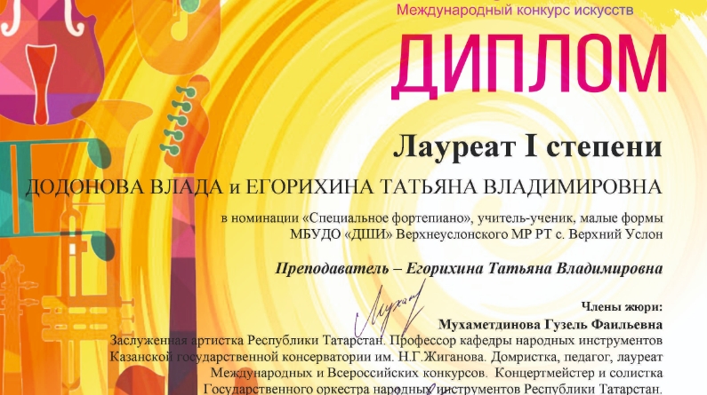 А в дуэте со своим преподавателем Татьяной Егорихиной Влада стала Лауреатом I степени в номинации "Учитель-ученик" конкурса "SUMMER TIME" (Казань), где строгое профессиональное жюри оценило единогласно исполнение "Концерта для клавира с оркестром" И. С. Баха фа минор в переложении для двух фортепиано.