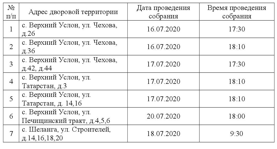 В период с 16 по 20 июля 2020 года на территории района запланированы встречи с собственниками жилых помещений многоквартирных домов по вопросу реализации республиканской программы «Наш двор»! Просим граждан, проживающих в этих домах, с соблюдением всех санитарных норм, активно принять участие в собрании.