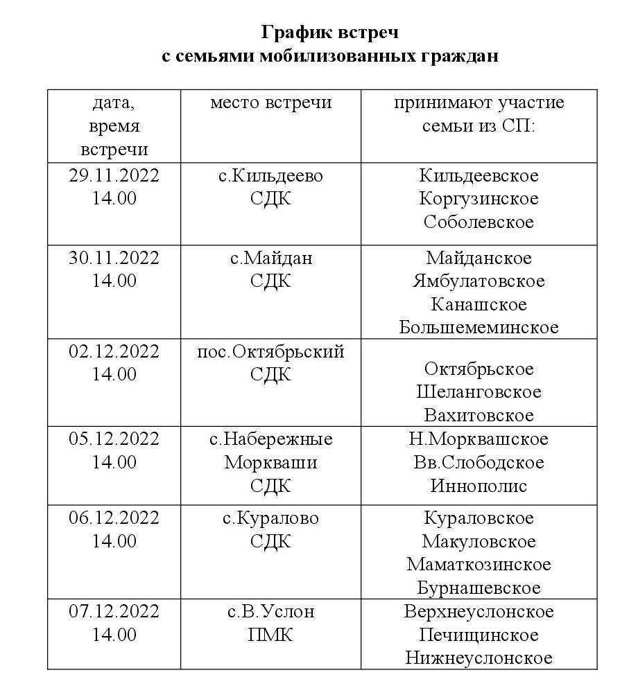 В течение двух недель, начиная с завтрашнего дня, 29 ноября Глава Верхнеуслонского муниципального района Марат Зиатдинов проведет встречи с семьями мобилизованных из района.