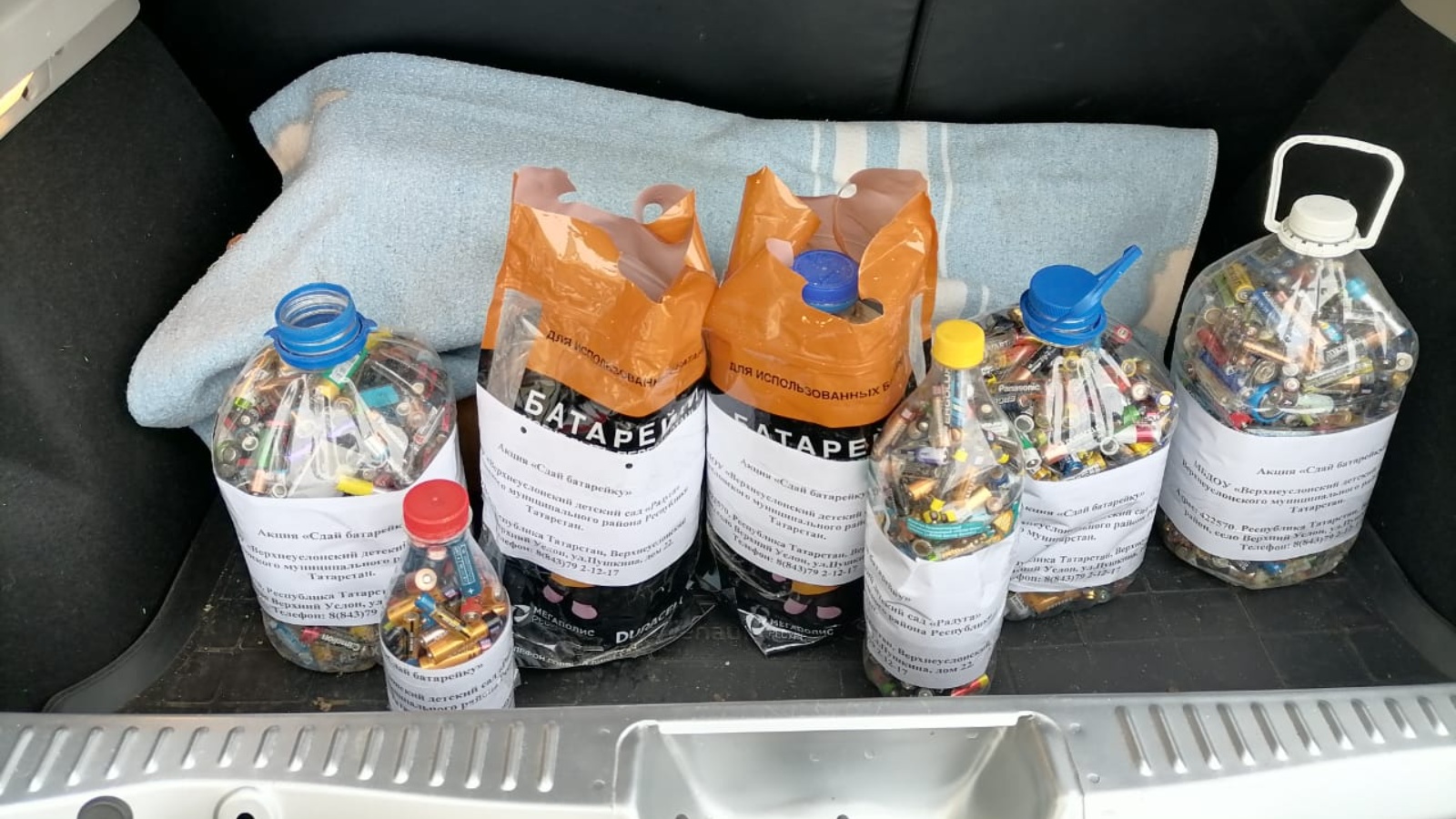 Сбор отработанных источников питания поступают в МБУДО «Центр дополнительного образования». От МБДОУ «Детский сад «Радуга» поступило (5 пятилитровых бутылок,1 двухлитровая и литровая бутылки) общим весом 31 кг. Весь сбор отработанных батареек передан представителю Министерства экологии РТ, консультанту Сафину Марату Вагизовичу.