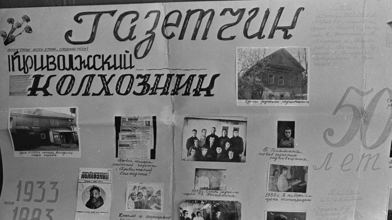 По черно-белым кадрам можно пролистать историю газеты с 1936 по 1990 годы, здесь и коллективы газеты разных лет, селькоры и сотрудники в т.ч. типографии, юбилейные мероприятия, посвященные 50 и 55-летию газеты.
