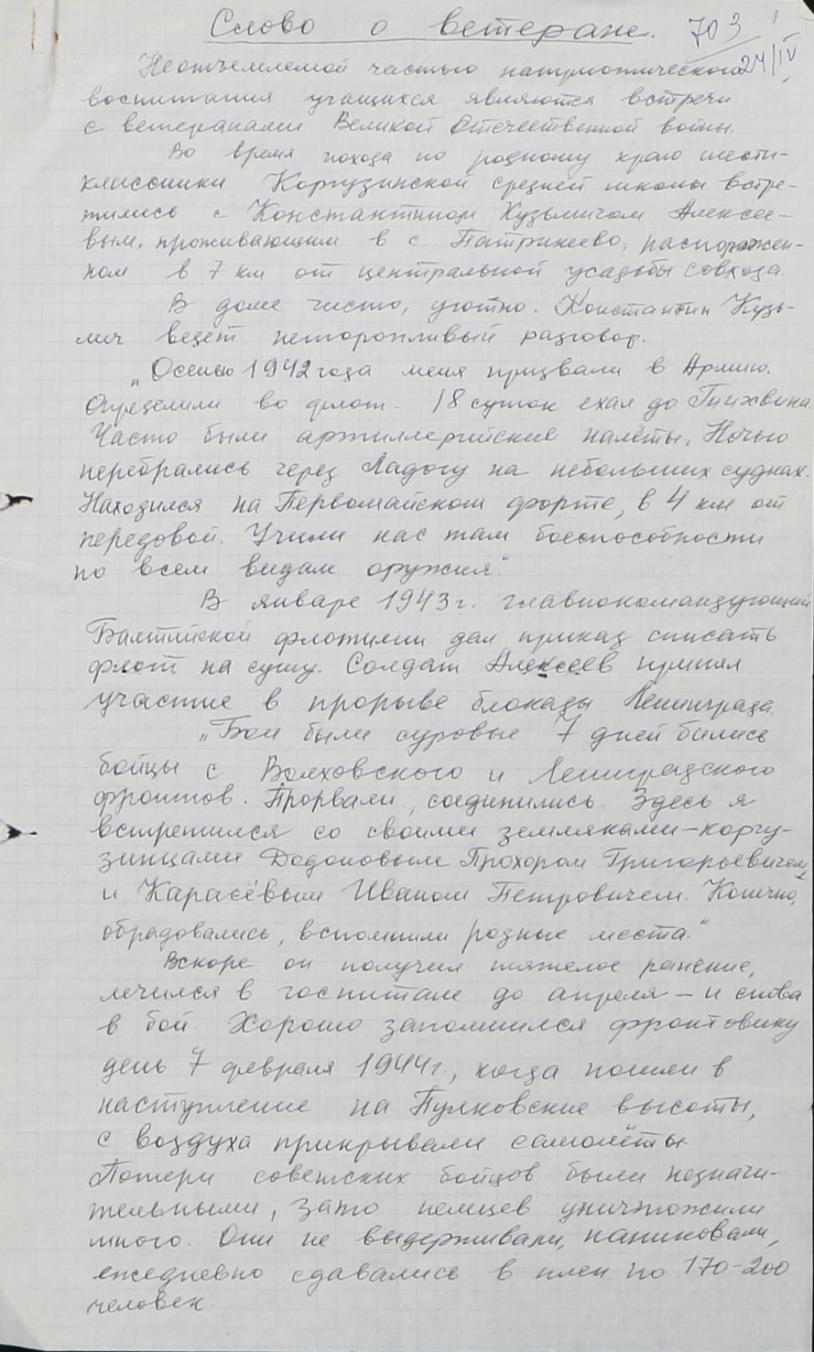 В Верхнеуслонском архиве имеется Коллекция документов «Воспоминания о ветеранах Великой Отечественной войны». Предлагаем ознакомиться с воспоминаниями нашего земляка Константина Кузьмича Алексеева о боевом пути, сражениях за Ленинград, записанными учительницей Коргузинской школы Калеевой Марией Николаевной в 1991 году.
