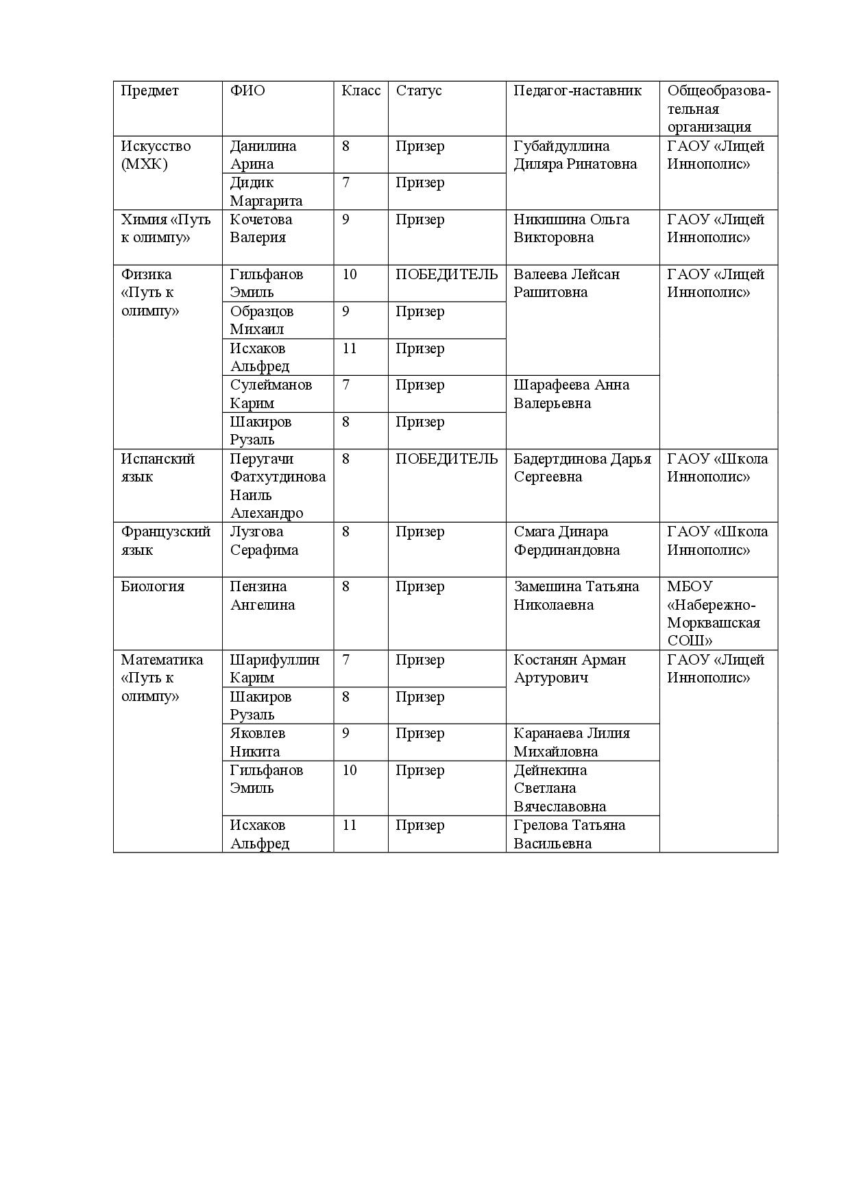 На данный момент проведены олимпиады по таким предметам как: искусство (МХК), физическая культура для 7-8 классов, английский язык для 5-8 классов, татарский язык и литература для детей, обучающихся татарскому языку как родному, французский язык, испанский язык, русский язык для 9-11 классов, химия, информатика и ИКТ, история, биология, экономика, физика, математика для 8-11 классов.