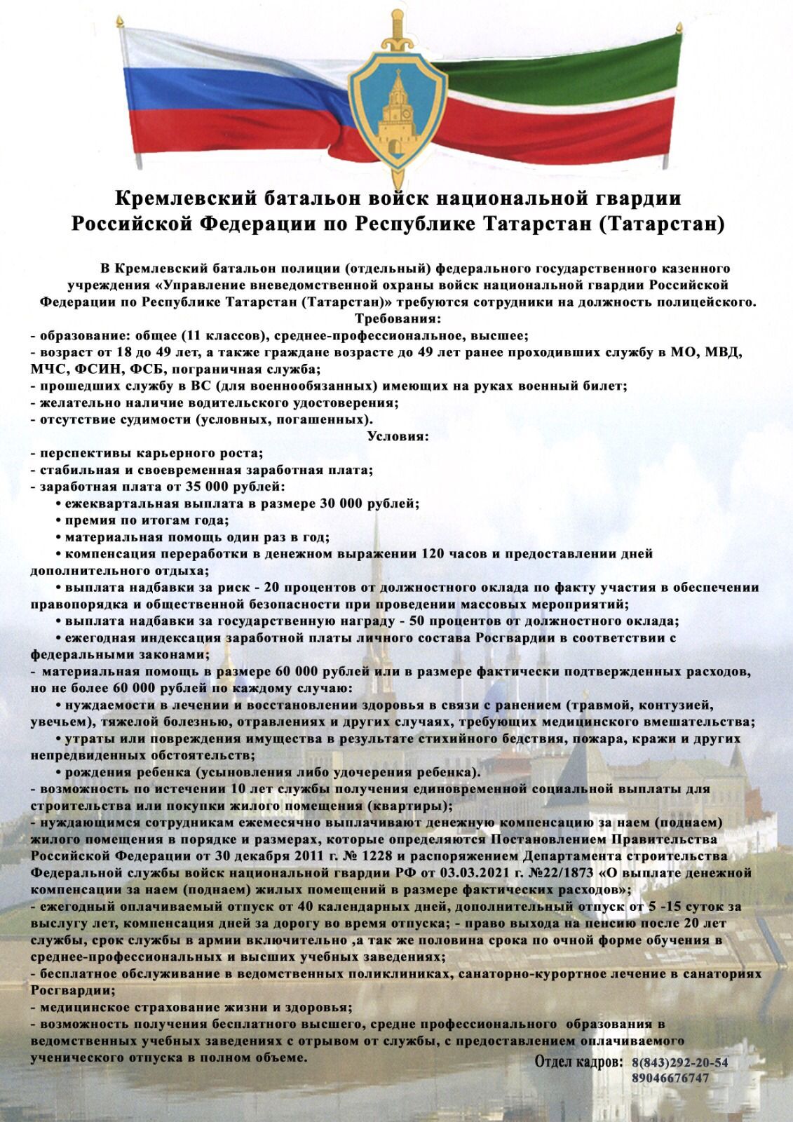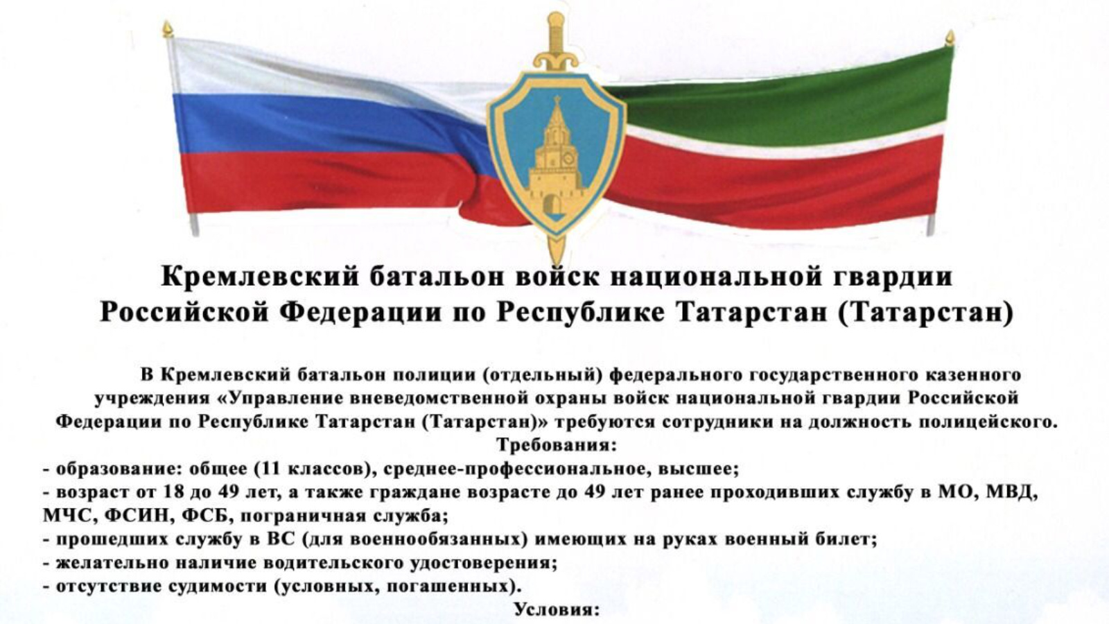 В настоящее время Кремлевский батальон полиции (отдельный) Центра по обеспечению безопасности высших должностных лиц федерального государственного казенного учреждения «Управление вневедомственной охраны войск национальной гвардии Российской Федерации по Республике Татарстан (Татарстан)» проводит отбор кандидатов для прохождения службы на должности полицейского.