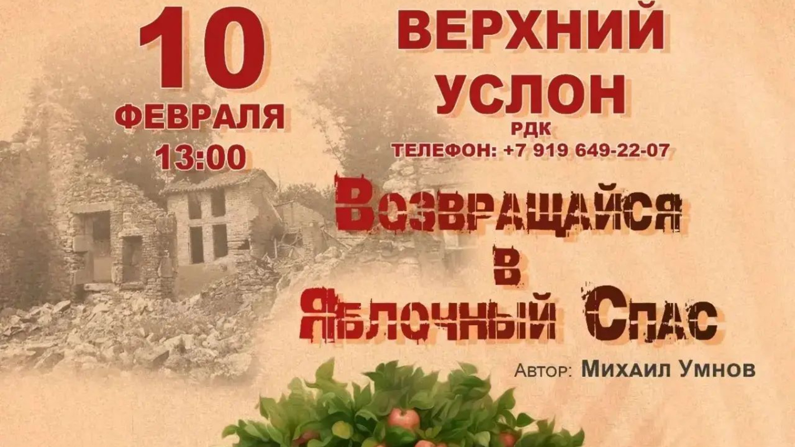 Погрузитесь в мир пьесы Михаила Умнова! 10 февраля в 13:00 на сцене РДК Верхнего Услона Буинский Государственный Драматический Театр представит спектакль "Возвращайся в Яблочный Спас". 16+