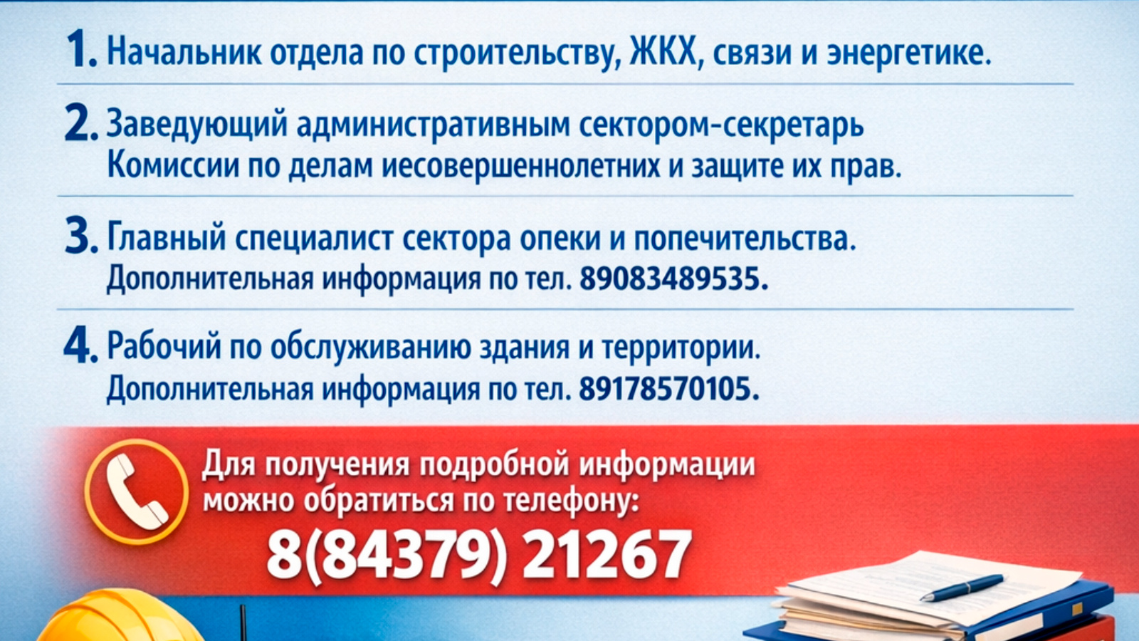 - рабочего по обслуживанию здания и территории (информация по телефону: 89178570105)