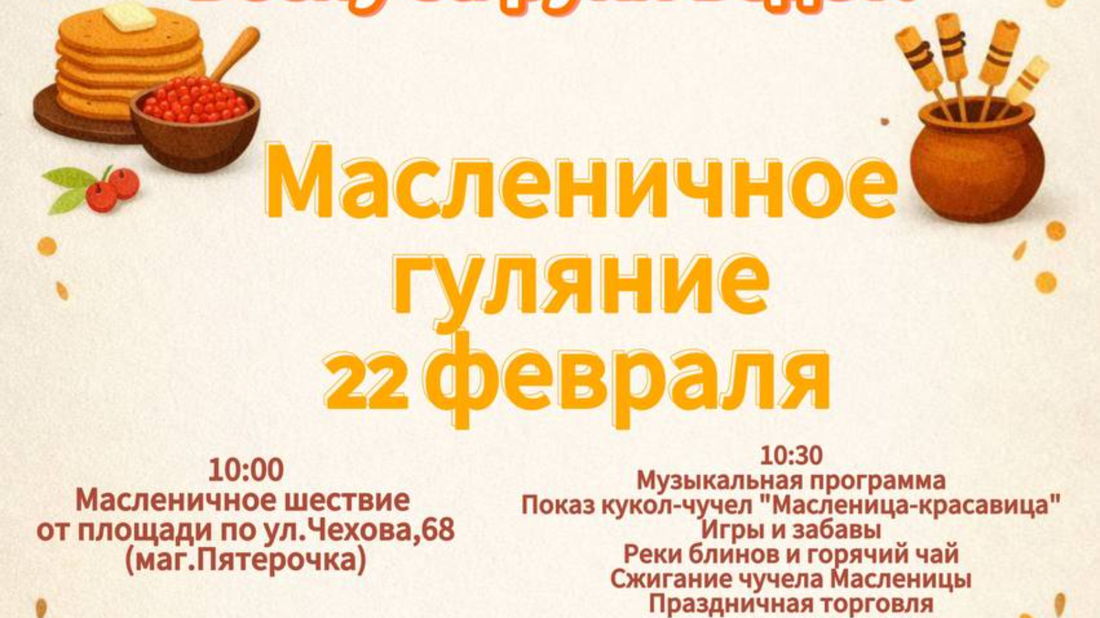 Дорогие жители и гости Верхнеуслонского района ! 22 февраля в 10:00 на площади по ул. Чехова, 68 (маг. Пятёрочка) состоится СТАРТ Масленичного шествия!