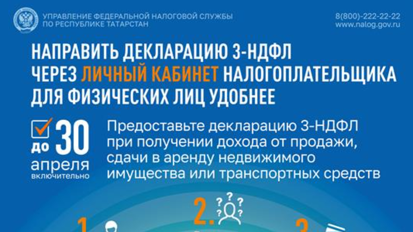 Для налогоплательщиков, которые подают декларацию исключительно для получения имущественных, социальных и инвестиционных налоговых вычетов, срок 30 апреля не обязателен. В этом случае декларацию можно подать в любое время в течение года. А если декларация подаётся одновременно и для декларирования доходов, и для получения вычетов, то подавать её нужно до 30 апреля.