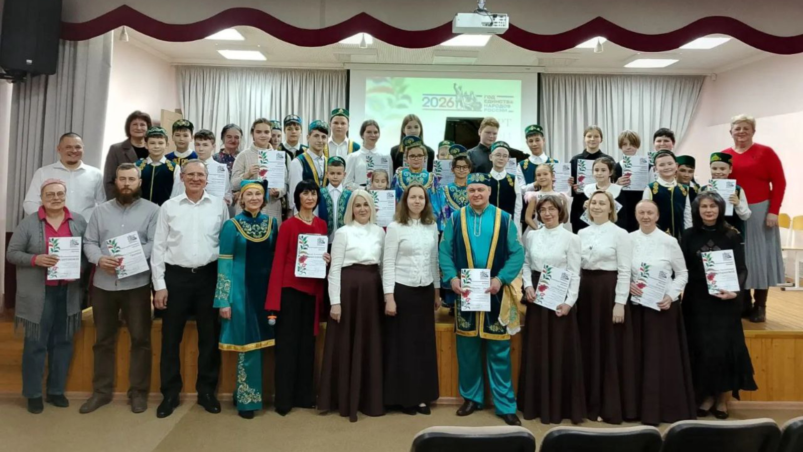 По завершении концертной программы к участникам и зрителям обратилась руководитель аппарата Совета Верхнеуслонского муниципального района Людмила Никитина. Она поблагодарила детей и преподавателей за проявленное мастерство, любовь к народной музыке и бережное отношение к национальным истокам, поздравила всех с началом Года Единства народов России и пожелала новых творческих достижений. Людмила Николаевна вручила участникам концерта Благодарственные письма от имени руководителя Исполнительного комитета Верхнеуслонского муниципального района Айрата Ахметшина за активное участие в концерте, вклад в сохранение и развитие национальной культуры. Со словами приветствия выступила руководитель местного отделения Всемирного конгресса татар Гульгена Искандеровна Давлетшина, которая передала тёплые приветствия от руководства Всемирного конгресса татар и отметила важность сохранения национального культурного наследия.