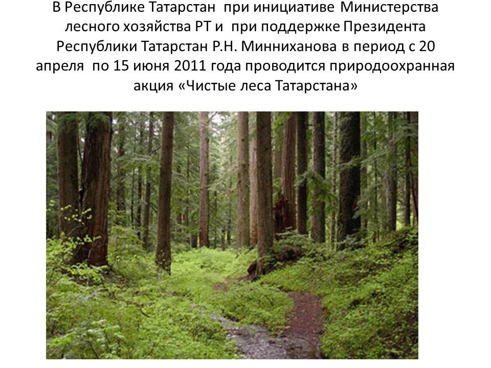 Традиционно Министерство лесного хозяйства Р.Т., два раза в год проводит природоохранную акцию «День посадки леса». Главная цель — привлечение внимания к проблеме сохранения российских лесов, а также воспитание у жителей страны бережного отношения к зеленому богатству Земли.