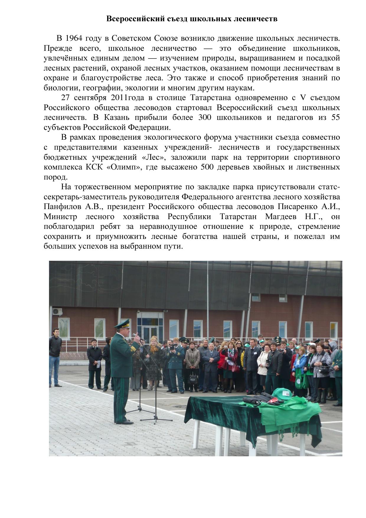 И.И. Исмагилов повел разговор об истории и необходимости возрождения школьных лесничеств: «В настоящее время повсеместно возрождаются школьные лесничества, ведь есть проблемы с восстановлением лесов, пострадавших от рубок и пожаров во всех России. Прежде всего – школьные лесничества – это объединение единомышленников, увлеченных единым делом - изучением природы, выращиванием и посадкой лесных растений, охраной лесных участков. Это также способ приобретения знаний по биологии, географии и другим наукам. Кто знает, ведь может быть именно работа в школьном лесничестве поможет выбрать дальнейший жизненный путь. Это один из методов экологического образования. Работа школьного лесничества - это не эпизодические мероприятия, а целостная, спланированная круглогодичная система учебной, трудовой, исследовательской, просветительской и культурной деятельности учащихся. В этом случае традиции сплачивают старших и младших учеников в единый коллектив, быстрее формируется неформальное общение, каждый находит свое место в деле охраны природы. В то же время экологическое объединение способствует индивидуальному развитию и становлению личности не только самостоятельно думающей и действующей, но и согласовывающей свои действия с коллективом, умеющей привлечь к своей деятельности других людей и способной оказать поддержку своим товарищам.»