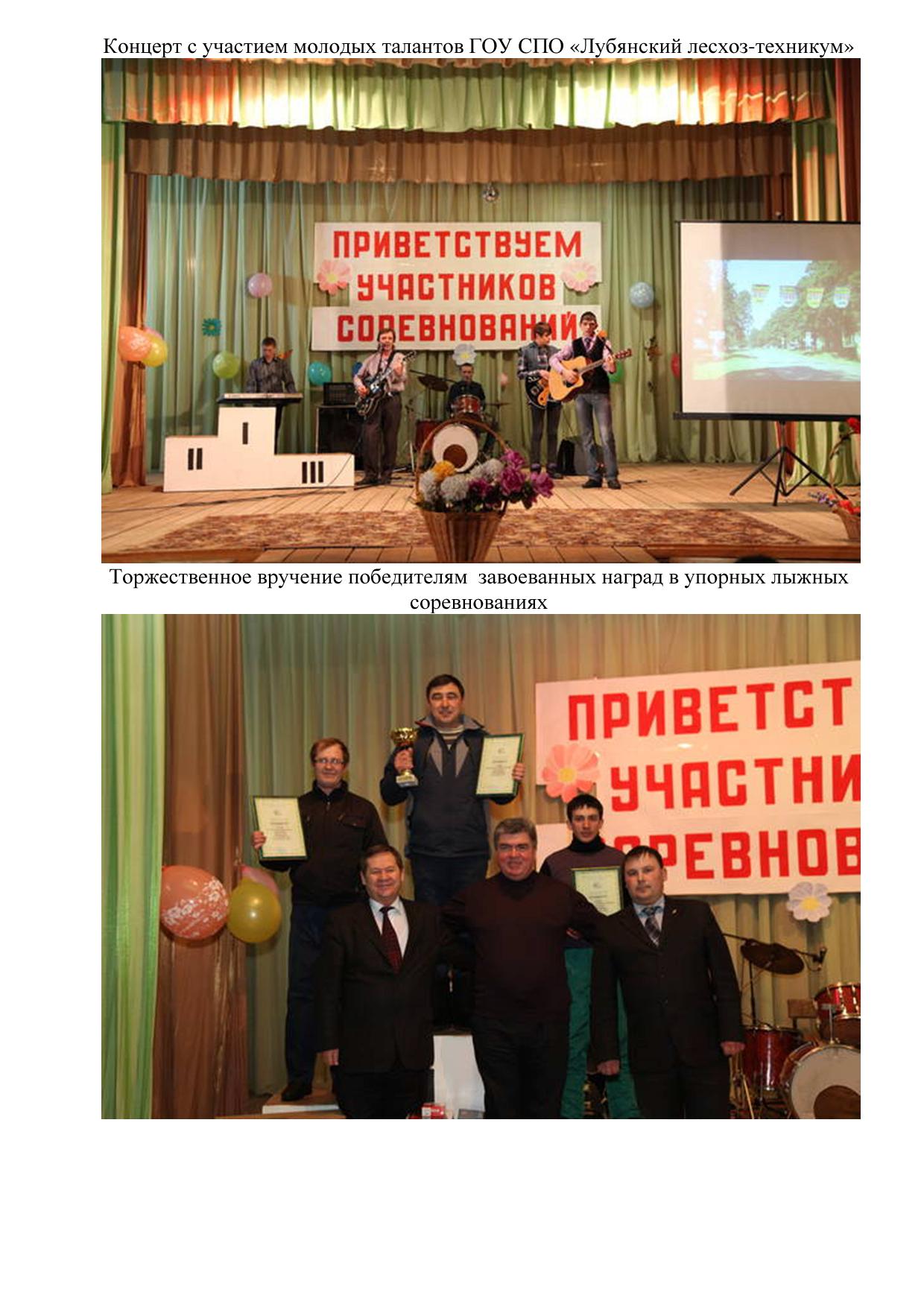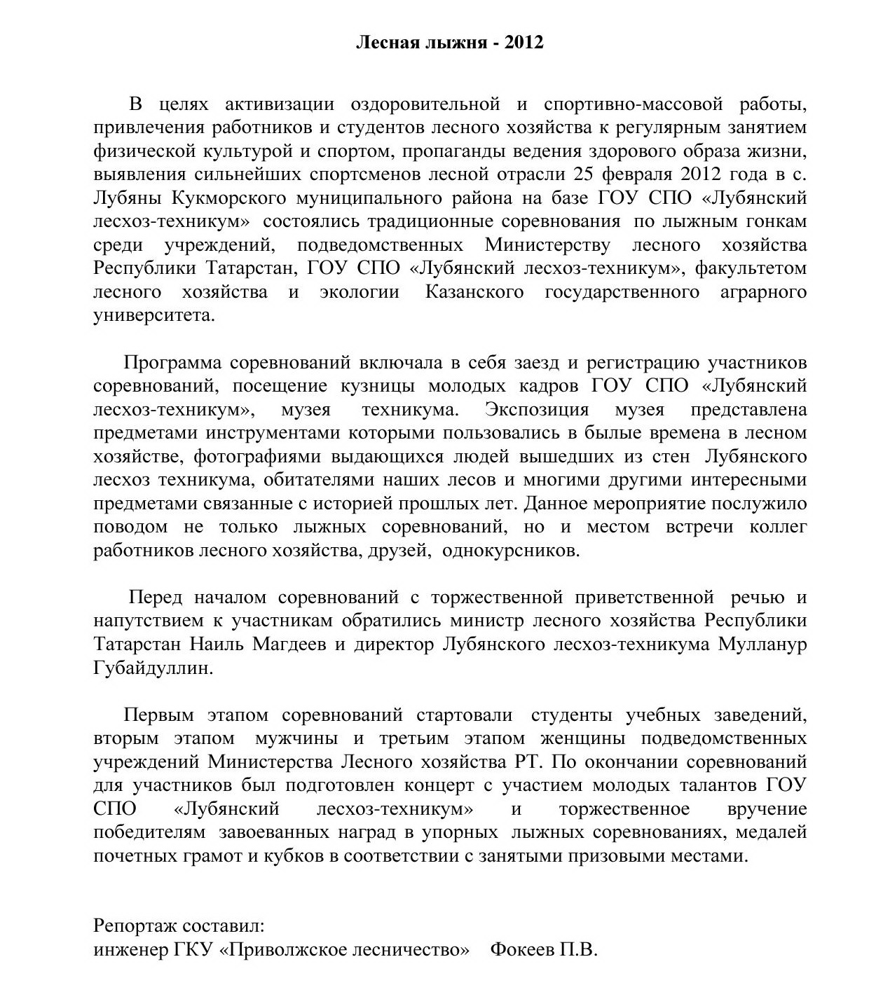 В целях активизации оздоровительной и спортивно-массовой работы, привлечения работников и студентов лесного хозяйства к регулярным занятием физической культурой и спортом, пропаганды ведения здорового образа жизни, выявления сильнейших спортсменов лесной отрасли 12 марта 2011 года в с. Лубяны Кукморского муниципального района на базе ГОУ СПО «Лубянский лесхоз-техникум» состоялись соревнования по лыжным гонкам среди учреждений, подведомственных Министерству лесного хозяйства Республики Татарстан, ГОУ СПО «Лубянский лесхоз-техникум», факультетом лесного хозяйства и экологии Казанского государственного аграрного университета.