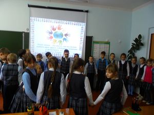 Сначала мы разобрали что обозначает слово толерантность на разных языках. Потом с ребятами играли в игру «Давайте поприветствуем друг друга» - приветствовали друг друга по-японски, по-английски по-немецки и по-русски. Провели «Аукцион знаний» на знание разных религий и основоположников. В заключение мы по очереди вставали в круг и называли что-то, что нас сближало, и делало похожим друг на друга. Далее сплотились покрепче, и весело сказали: «Мы вместе сделаем толерантным весь мир!»
