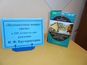 Выставка-реклама одной книги «Путешествие вокруг света», посвящённое к 245-летию Ивана Крузенштерна. Прекрасное издание об увлекательном и подробном рассказе о первой русской кругосветной экспедиции, в которой был собран огромный астрономический, географический и этнографический материал.