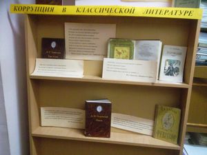 Представляя присутствующим выставку произведений классики, она отметила, что вопросы коррупции присутствовали в произведениях Н.В.Гоголя «Ревизор». «Мёртвые души», Н.А.Островского « Гроза», «Доходное место», А.С.Пушкина «Дубровский и т.д.