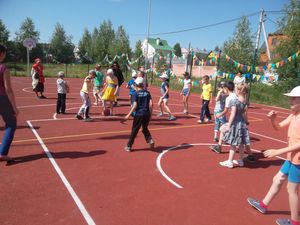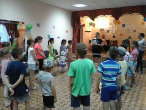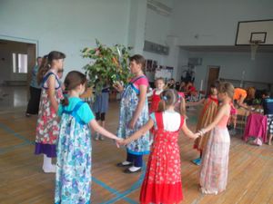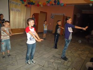 Под зажигательную музыку вожатые вместе с воспитанниками выполняют танцевальные движения.