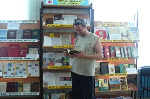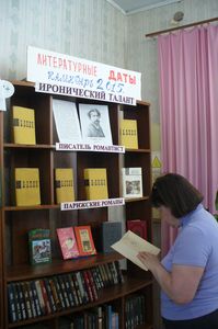 У выставки библиотекарь проводит с читателями беседы о жизни и творчестве писателя и обзоры представленных на выставке книг.
