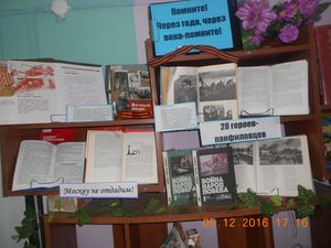 В разделе выставки «28 героев – панфиловцев» знакомит читателей с примером мужества и героизма среди частей Красной Армии, тысячи советских воинов отдали свои жизни в боях под Москвой, но именно подвиг героев-панфиловцев остался в истории и сыграл в годы войны исключительную мобилизующую роль, о силе и мужестве героев ходили легенды.