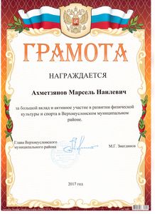 Сегодня на совещании «деловой понедельник» заместителем Главы Верхнеуслонского муниципального района С.Осяниным была вручена Грамота Главе Ямбулатовского сельского поселения М.Н. Ахметзянову «За большой вклад и активное участие в развитии физической культуры и спорта в Верхнеуслонском муниципальном районе Республики Татарстан».