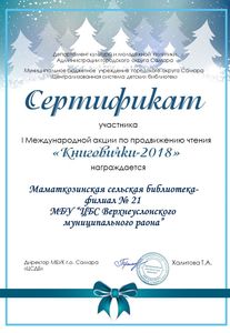 9 января Маматкозинская сельская библиотека получила сертификат за участие в акции «Книговички-2018», которая проводилась в рамках реализации Программы продвижения чтения - 2018г. Организатором являлись МБУК г.о. Самара «Централизованная система детских библиотек».