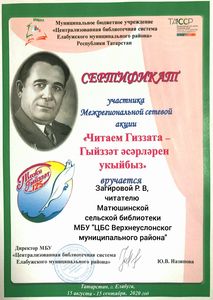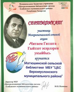 В рамках реализации мероприятий по подготовке и проведения 100 – летия образования ТАССР в Матюшинской сельской библиотеке оформлена выставка – иллюстрация периодических изданий «Татарстан – минем туган җирем!». На ней представлены материалы, связанные с историей образования Татарской АССР и о современном облике Республики.