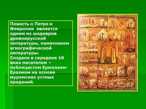 Самое почтенное произведение «Слово о полку Игорове». В основе сюжета этого произведения не только события неудачного похода на половцев князя Игоря в 1185 году, но и события из княжеских междоусобиц, походов и удачных битв, начиная с древнейших времен. Перед нами народная эпопея в книжном изложении писателя конца XII в., в этом году отмечает свое 835-летие.