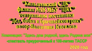 Работники Кильдеевского сельского Дома культуры приняли участие в районном театральном фестивале - конкурсе "Театральный переполох", среди творческих объединений организаций сферы культуры Верхнеуслонского муниципального района 2020 года, с театральной постановкой "Дед, Бабка и брачный контракт", в номинации "Здесь дом родной, здесь Родина моя", приуроченный к 100 - летию ТАССР. Данный фестиваль содействует всестороннему развитию театрального искусства и совершенствованию мастерства участников. В ходе подготовки работники культуры, проводили репетиции, подбирали соответствующую теме атрибутику и декорации. Коллектив предоставил видео с постановкой, своим подписчикам.