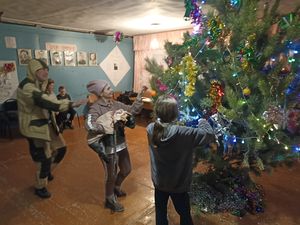 Собравшиеся все вместе встали возле сверкающей огнями ёлочки в хоровод и спели под баян традиционную песню «В лесу родилась ёлочка».
