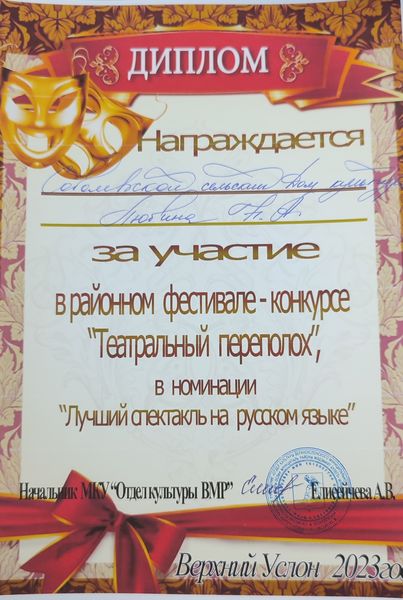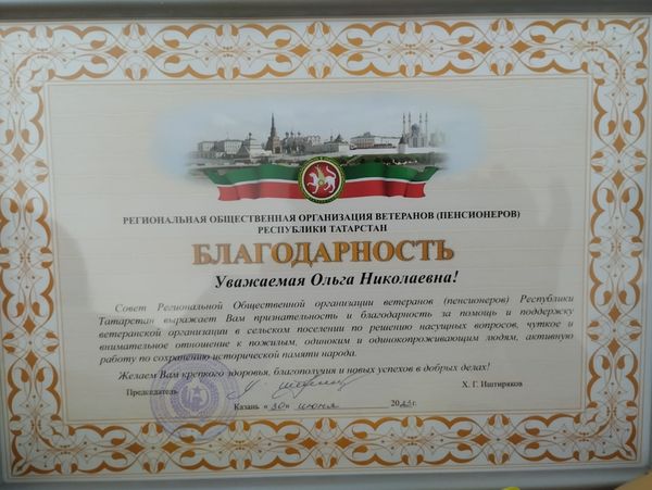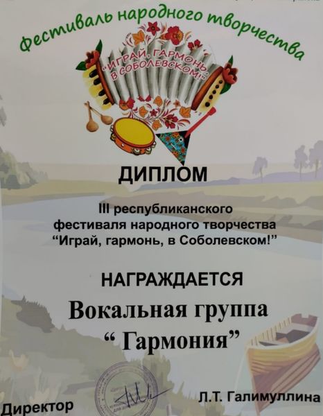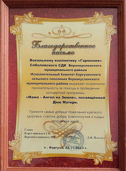 Вокальная группа «Гармония» Соболевского сельского дома культуры награждена Благодарственным письмом от Исполнительного комитета Коргузинского сельского поселения за помощь в проведении концертной программы «Мама- Ангел на Земле», посвященный Дню Матери.