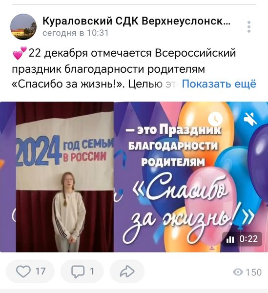 22 декабря отмечается Всероссийский праздник благодарности родителям «Спасибо за жизнь!». Целью этого праздника является воспитание детей и подростков в духе уважения и почитания родителей, привитие чувства благодарности за дар жизни, осознание ценности жизни, гармонизация родительско-детских отношений, укрепление семейных ценностей и профилактика одинокой старости. Участники клубных формирования Кураловского СДК приняли участие в акции "Спасибо за жизнь", они искренни поздравили своих родителей с праздником, поблагодарил за жизнь и счастливое детство. День благодарности родителям – это день особенного памяти, ценности и любви. Это возможность вспомнить о том, какое большое счастье мы получаем от наших родителей, и отдать им должное. Поэтому давайте не упускать эту возможность и выразим благодарность своим родителям не только в этот праздник, но и каждый день.