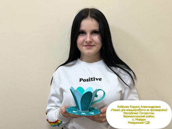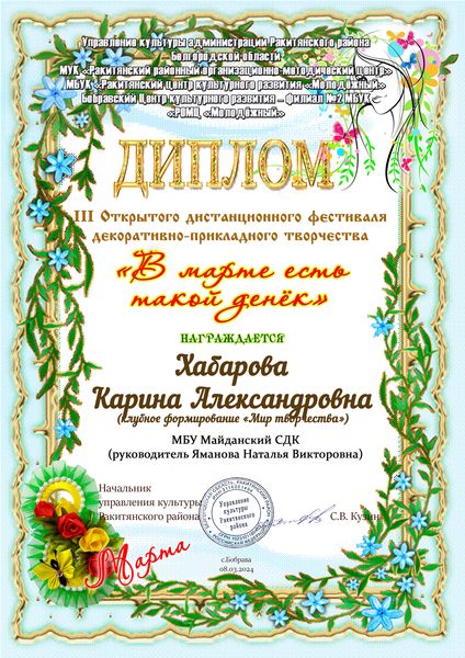 От Майданского сельского Дома культуры Хабарова Карина - участница клубного формирования «Мир творчества» приняла участие в III Открытом дистанционном фестивале декоративно- прикладного творчества «В марте есть такой денек», который проходил в рамках празднования Международного женского дня. Участница и руководитель награждены дипломом.