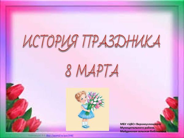 Майданская библиотека подготовила презентацию «История праздника 8 Марта». Из презентации читатели узнают, почему Международный женский день празднуется именно 8 марта, как отмечают в других странах, что принято дарить и что можно дарить женщинам в этот день.