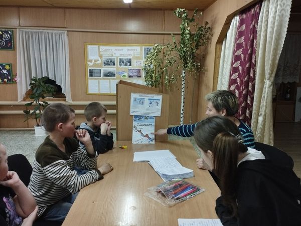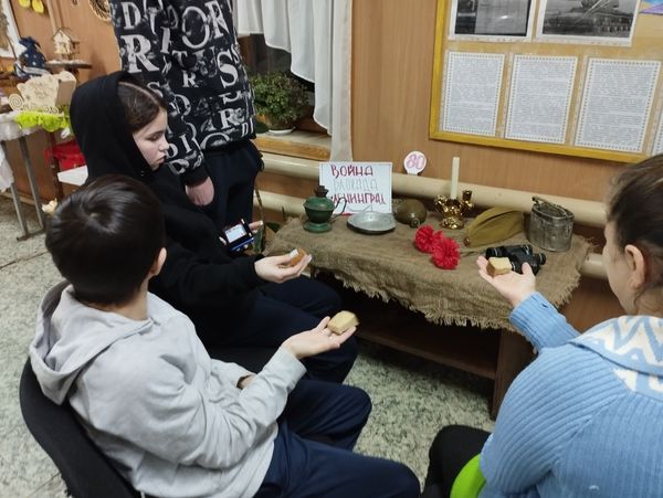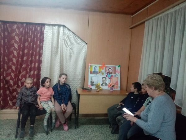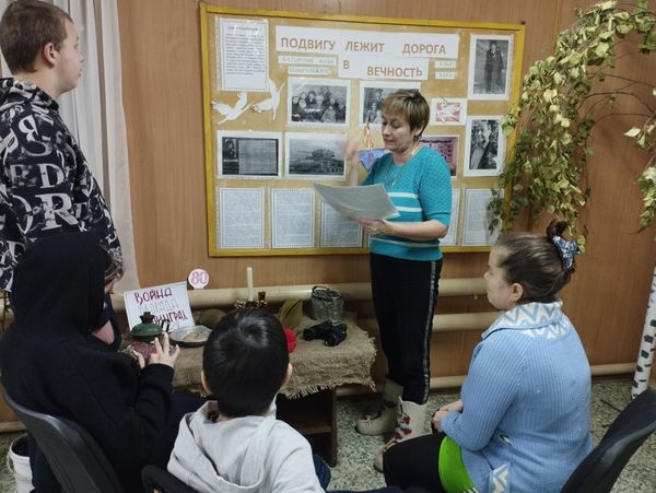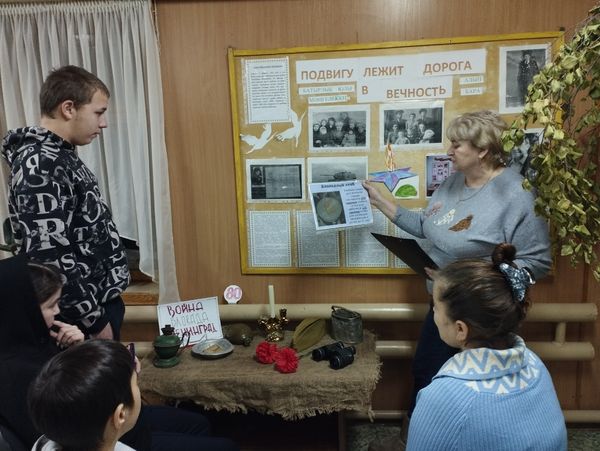 Сотрудники СДК возле тематического уголка под названием «Война, блокада, Ленинград», рассказали ребятам о тяжелых испытаниях, выпавших на долю жителей осажденного закрытого города Ленинграда: о голоде и холоде, о детях и женщинах, работавших наравне с мужчинами на заводах, о защите и обороне Ленинграда советскими солдатами.