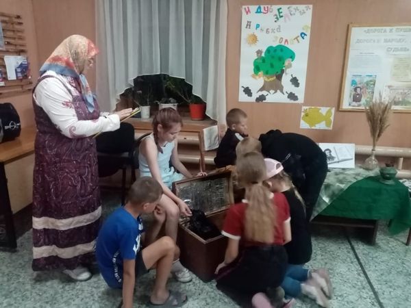 В конце путешествия ребята добрались до зелёного дуба и помогли «Коту Учёному» повесить волшебные дубовые листочки. А финалом путешествия стал сундук с сокровищами, а сокровищами были сладости. К данному мероприятию был оформлен тематический стенд «Дорога к Пушкину, -дорога к народу, Родине, судьбе».