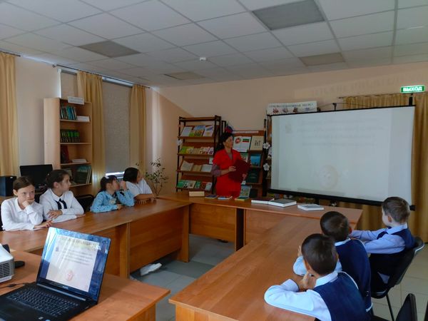 Библиотекарь ознакомила школьников с жизнью и творчеством Льва Толстого, его книги учат добру и справедливости.