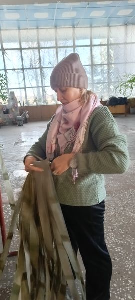 Маскировочная сеть для солдата, который находится на позиции, не менее важна, чем бронежилет или каска. Плетение сетей — дело кропотливое, в каждую её ячейку вплетается руками доброта и любовь, поэтому такая защита надёжней любой брони. Процесс это трудоёмкий, материалы нужны специальные, ткань и сети очень дорогие. Одновременно работают до десяти человек: кто-то ленту режет, кто-то плетёт, кто-то натягивает, работают одной дружной командой. «Мы рады помогать нашим воинам. Надеемся, что это наш маленький вклад в большую победу!