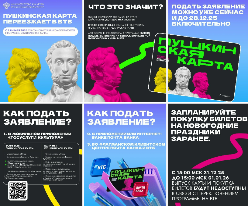 С 1 января 2026 года банком-оператором программы «Пушкинская карта» станет ВТБ. Пушкинская карта от Почта Банка будет действительна только до 15:00 31 декабря текущего года.