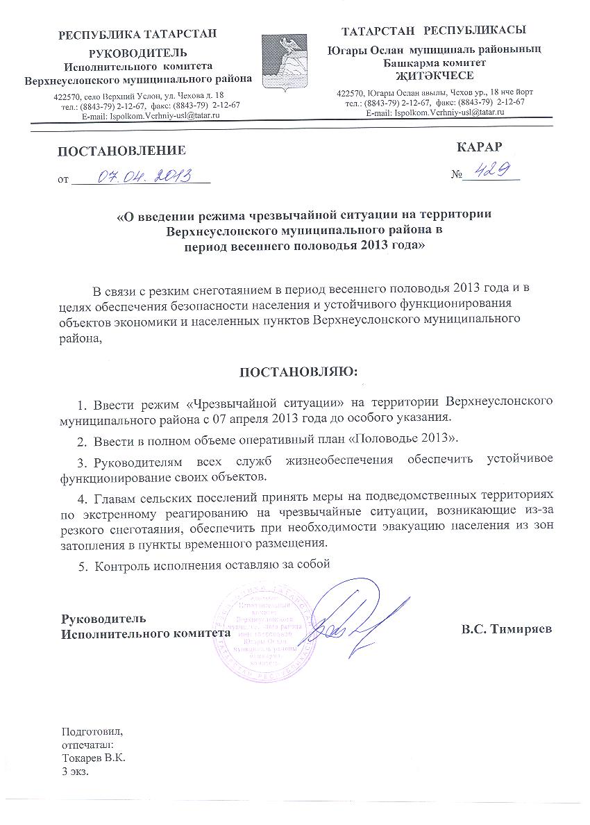 Постановление Исполнительного комитета Верхнеуслонского муниципального района Республики Татарстан «О введении режима чрезвычайной ситуации на территории Верхнеуслонского муниципального района Республики Татарстан в период весеннего половодья 2013»