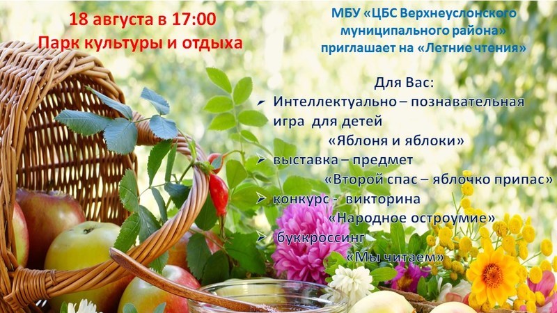18 нче августта 17.00 сәгатьтә районның Культура һәм ял паркында район үзәге китапханәчеләре тарафыннан “Җәйге укулар” оештырыла. Анда төрле конкурслар, викторина һәм “Без укыйбыз!” дигән буккроссинг үткәрелә.